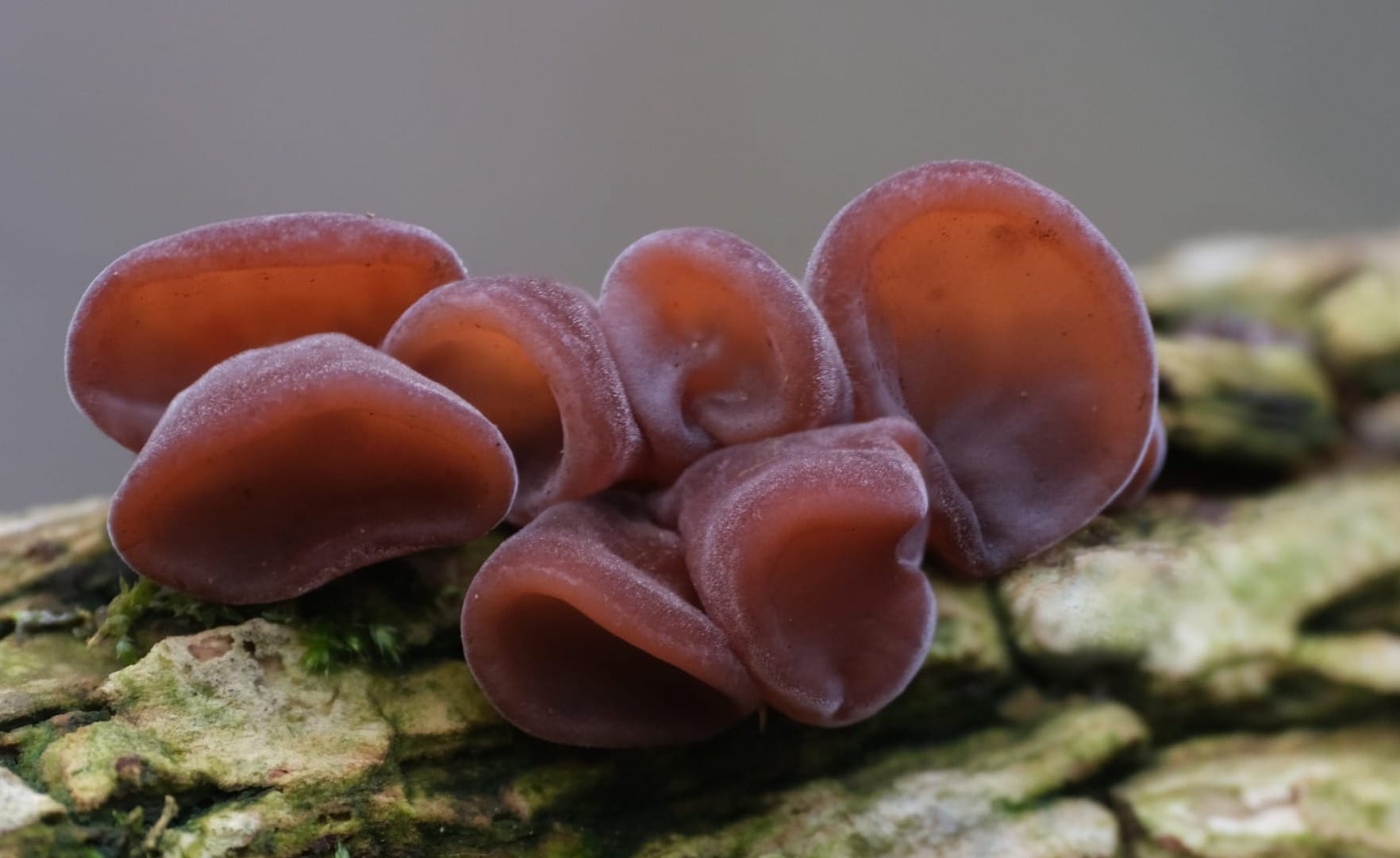 Più sobria ma altrettanto curiosa è Auricularia auricula-judae, comunemente chiamata “orecchia di Giuda”, che si sviluppa con una forma lobata e cartilaginea, brunastra, simile a un padiglione auricolare. Cresce prevalentemente su rami morti di latifoglie con preferenza per sambuco, pioppo e Quercus sp., e il suo aspetto carnoso ma flaccido, soprattutto quando reidratato dalla pioggia, rientra a pieno titolo nell’estetica del perturbante. Anche in questi casi, l’umidità non è solo un fattore esterno, ma la condizione strutturale necessaria alla fruttificazione e alla sopravvivenza. La consistenza gelatinosa non è un’anomalia: è un tratto selezionato evolutivamente per vivere a lungo e in ambienti discontinui, dove l’acqua compare e scompare in brevi cicli. L’aspetto “spettrale” di queste forme è solo il lato visibile di una strategia biologica raffinata, in cui l’evanescenza e la reversibilità diventano strumenti di resistenza.