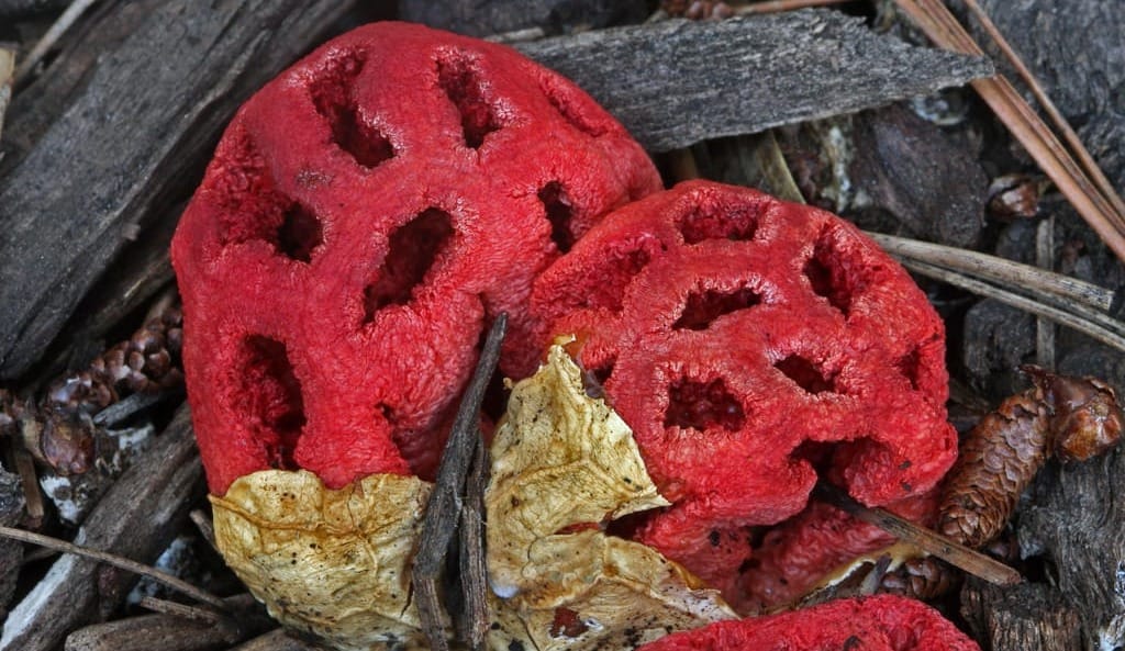 Tra le forme più singolari dell’intero regno fungino, alcune si impongono per la loro struttura complessa, l’aspetto inconfondibile e le strategie biologiche altamente specializzate. Non si tratta di semplici curiosità morfologiche, ma di espressioni evolutive legate a un preciso meccanismo ecologico: la disseminazione entomofila. Il più noto tra questi è Clathrus ruber, presente anche in Italia e conosciuto come "fungo lanterna" o "cuore di strega". Quando matura, la struttura primaria racchiusa in ovolo si lacera rivelando un corpo fruttifero a reticolo tridimensionale, di colore rosso-aranciato, che ricorda una gabbia aperta, uno strano alveare o un’armatura organica. Gli apici delle maglie sono percorsi da solchi profondi, mentre la parte interna è ricoperta da una gleba mucillaginosa verdastra, dall’odore fortemente fetido, spesso paragonato a carne in decomposizione. Quell’odore non è un dettaglio accessorio: contiene composti volatili solforati e ammoniacali che attraggono ditteri necrofili, soprattutto mosche, le quali — nell’atto di nutrirsi o deporre uova — si ricoprono involontariamente di spore, favorendone il trasporto e la dispersione.