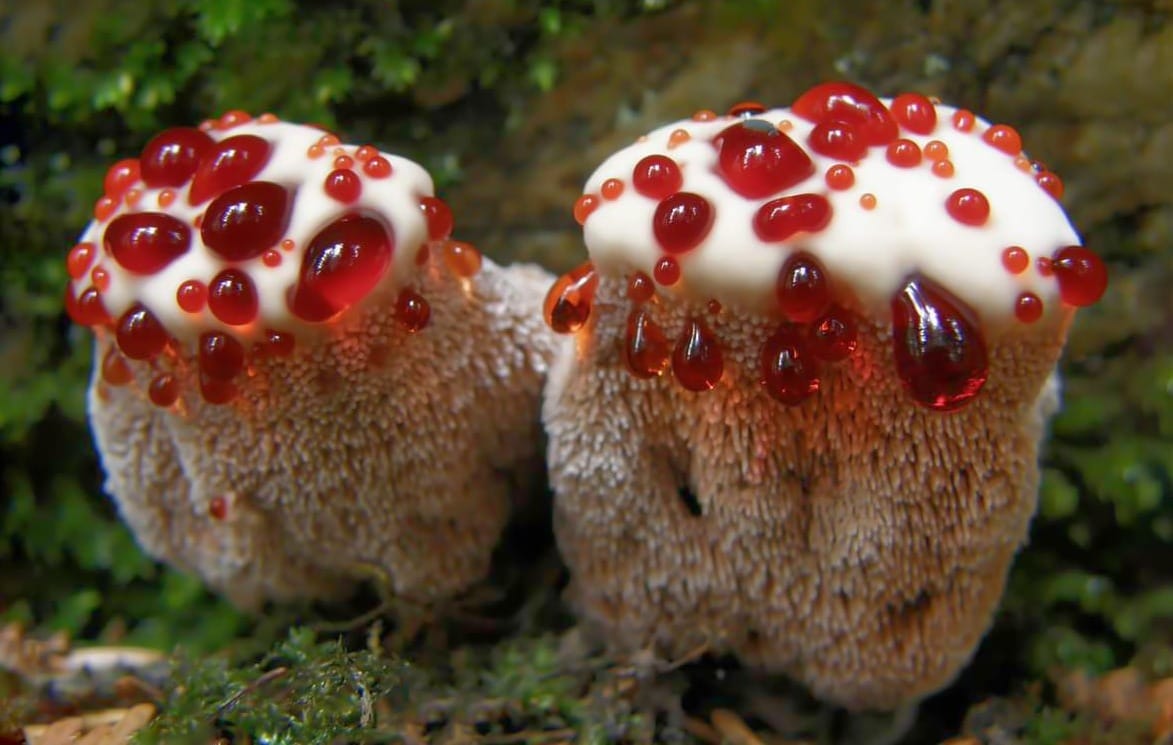 Tra i funghi che più colpiscono per l’aspetto drammatico, Hydnellum peckii si distingue per le caratteristiche gocce rosse che affiorano sulla superficie del cappello, biancastro o grigio‑rosato nei giovani esemplari. Non si tratta di sangue, ma di guttazione attiva: un processo attraverso cui il fungo espelle, in condizioni di elevata umidità relativa, fluidi ricchi di pigmenti, composti fenolici e metaboliti secondari, probabilmente implicati nella difesa chimica o nella regolazione idrica. Sebbene la guttazione sia nota in varie idnacee, in H. peckii (specie diffusa in Italia, sotto conifere) raggiunge un’intensità tale da evocare un segnale d’allarme visivo, quasi una mimetizzazione inversa, in cui il fungo si rende volutamente appariscente. Non è chiaro se ciò svolga un ruolo deterrente, attrattivo o puramente escretivo, ma il dato certo è che la produzione dei pigmenti è influenzata da condizioni ambientali precise — acidità del substrato, attività enzimatica, presenza di conifere ospiti.