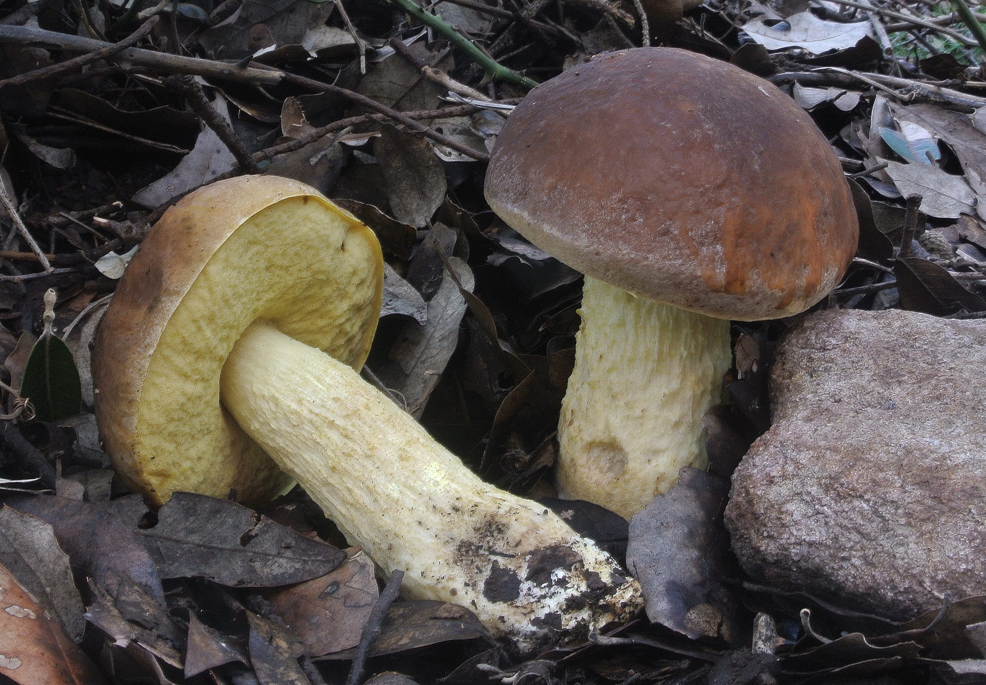 Da un punto di vista pratico, per chi vuole leggere questi ambienti con occhio micologico, la conseguenza è semplice: ha poco senso aspettarsi buttate significative in macchia dopo il primo rovescio di fine estate, a meno che le piogge siano abbondanti e il clima non troppo torrido. Conviene osservare la sequenza degli episodi piovosi, la risposta della vegetazione e lo stato della lettiera. Quando la lettiera di leccio, prima rigida e scricchiolante, torna morbida e leggermente compatta sotto i passi, quando compaiono i primi muschi attivi sui tronchi e sulle pietre ombreggiate, quando la macchia “profuma” di acqua assorbita e non solo di terra bagnata in superficie, allora le condizioni per una fruttificazione consistente sono davvero in atto. In questo scenario, alcuni funghi eduli assumono un significato particolare. Il porcino nero, Boletus aereus, è il simbolo stesso delle leccete e delle sugherete mediterranee: preferisce boschi maturi, suoli ben drenati ma con una lettiera abbondante, ed è tipicamente tardivo. Comparsa e abbondanza variano molto da zona a zona, ma il tratto comune è la sensibilità al quadro idrico complessivo dell’autunno. Il porcinello d'inverno, Leccinellum lepidum, si inserisce nello stesso contesto, spesso in stazioni leggermente più aperte e aride, ma con una spiccata capacità di fruttificare anche a temperature relativamente basse, quando altri boleti sono scomparsi, con preferenzialità per il semestre novembre-aprile.