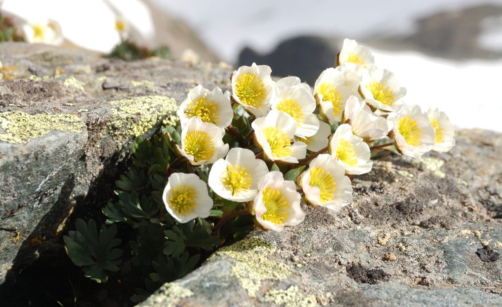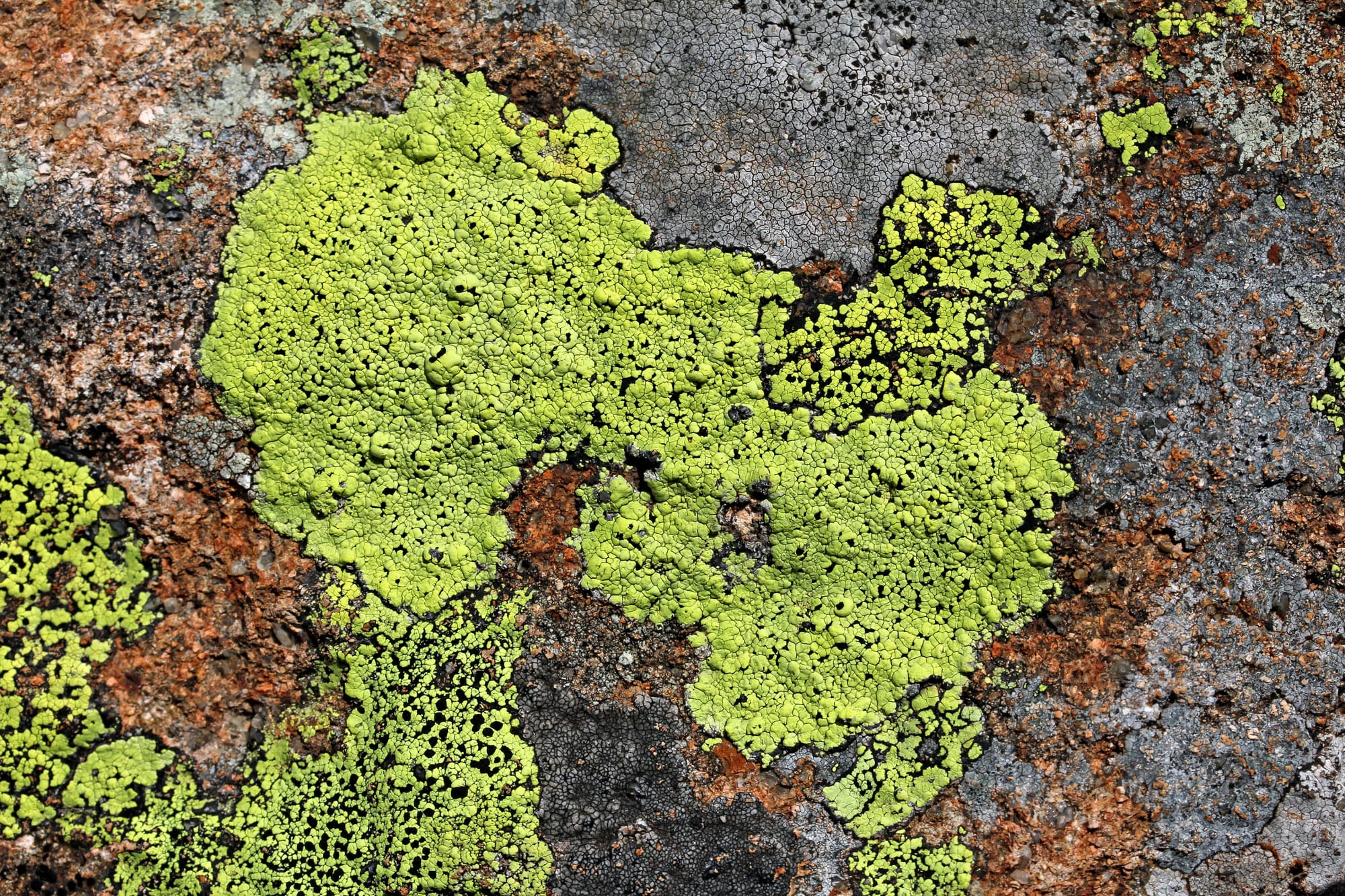 I licheni sono i primi a colonizzare le zone in cui i ghiacciai si ritirano, trasformando un deserto minerale in un terreno che, nel tempo, potrà ospitare nuova vita. Quando la lingua glaciale si assottiglia e lascia emergere superfici rimaste celate sotto il ghiaccio per secoli, sono proprio questi organismi discreti a insediarsi per primi, inaugurando un processo di colonizzazione che può durare decenni. Frutto di un'antichissima simbiosi tra un fungo e un'alga microscopica o un cianobatterio, i licheni sono in grado di fissare il carbonio atmosferico grazie alla fotosintesi e di accumulare nutrienti preziosi, indispensabili per gli stadi successivi della successione ecologica. Alcune specie crostose, come quelle dei generi Rhizocarpon, Xanthoria e Lecanora, formano incrostazioni compatte che aderiscono tenacemente alla roccia e tollerano sbalzi termici vertiginosi e livelli di radiazione ultravioletta che poche altre forme di vita saprebbero sopportare. Tra queste, Rhizocarpon geographicum, uno fra i più diffusi sulle nostre Alpi, si distingue per le colonie verdastre delimitate da bordi neri che disegnano sulla pietra figure simili a carte geografiche. La sua presenza non è solo un ornamento naturale, ma indica anche che la superficie è rimasta libera dal ghiaccio per un periodo di tempo sufficiente a permettere una colonizzazione stabile.