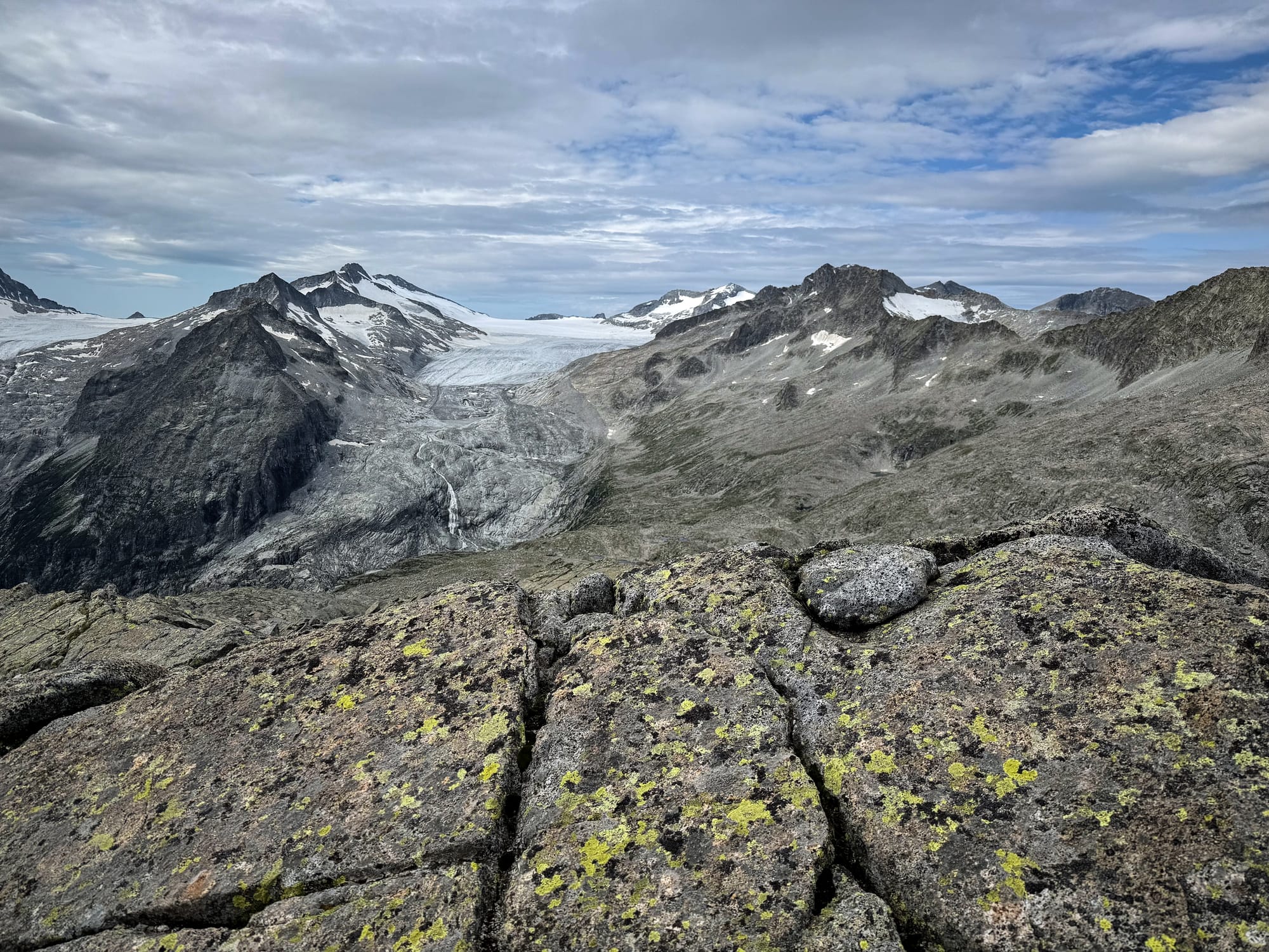 La colonizzazione di una superficie appena esposta dal ritiro glaciale è un processo sorprendentemente lento, che si misura in decenni. I licheni crostosi, come Rhizocarpon geographicum, iniziano a stabilirsi solo dopo alcuni anni dall’affioramento della roccia, quando l’umidità atmosferica e le polveri trasportate dal vento offrono condizioni minime di attecchimento. In genere, occorrono dai 5 ai 10 anni perché compaiano le prime microcolonie visibili a occhio nudo. La crescita, poi, è estremamente contenuta: Rhizocarpon si espande in media di 0,3–0,5 millimetri all’anno, anche meno in alta quota, dove le temperature sono più rigide e le stagioni vegetative molto brevi. Per coprire un sasso di pochi centimetri con un mosaico completo di colonie mature possono essere necessari oltre 30, 50, ma anche 70 anni. È proprio questa lentezza a rendere i licheni strumenti preziosi di datazione: la dimensione delle loro colonie racconta con sorprendente precisione da quanto tempo una superficie è emersa dal ghiaccio. La roccia che oggi appare spoglia diventerà, con la pazienza di intere generazioni di licheni, la base di un futuro tappeto vegetale.