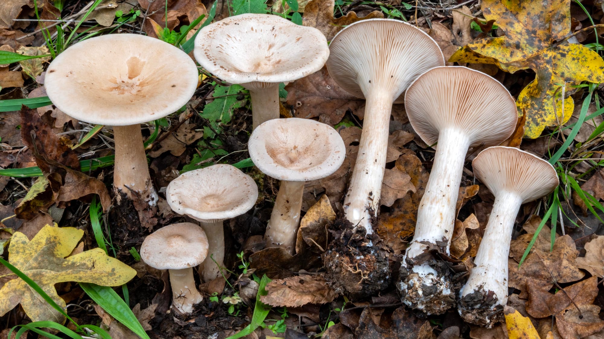 Molto diverso è il discorso per le Prealpi e per l’Appennino, dove i boschi misti di latifoglie, se ben esposti e protetti, possono ancora offrire occasioni interessanti. Il fattore determinante, in questo contesto, è la combinazione tra esposizione solare, persistenza della copertura fogliare e umidità residua della lettiera. Nei versanti rivolti a sud o a est, soprattutto tra faggi, cerri, castagni e carpini che non hanno ancora completamente perso le foglie, si conservano microclimi adatti alla maturazione degli ultimi funghi simbionti della stagione. È proprio nei boschi collinari e appenninici che entrano in scena alcune delle specie più emblematiche del tardo autunno. Infundibulicybe geotropa, un tempo nota come Clitocybe geotropa, è forse il vero fungo di San Martino: compare spesso proprio attorno all’undici novembre, nelle radure erbose ma anche ai margini di boschi di latifoglie. La sua forma imbutiforme, con cappello massiccio, color crosta del pane, e il gambo robusto, sorregge fitte lamelle che decorrono lungo il gambo; ma ciò che colpisce, oltre alla mole, è il suo ordine: questi funghi non nascono a caso, ma in file, semicerchi o cerchi quasi perfetti, come se obbedissero a un disegno sotterraneo.